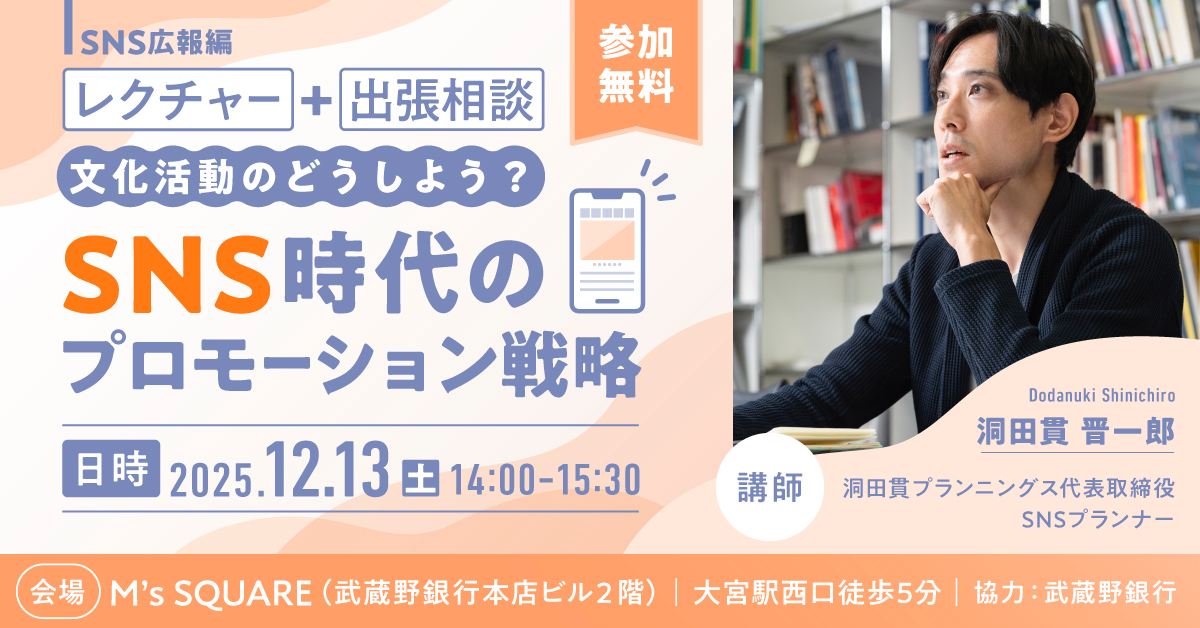講座終了後に実施する予定です。 ※講師(洞田貫 晋一郎 氏)、事務局(プログラムディレクター等)ともに、個別相談は定員となりました。 日 程|12月13日(土)15:40~16:30の内、10~15分程度(予定) 相談員|講師(洞田貫 晋一郎 氏)、 申 込|上記の申込フォームから(先着順) 内 容|文化芸術の分野でのSNS広報について(対応:講師 洞田貫 晋一郎 氏) |