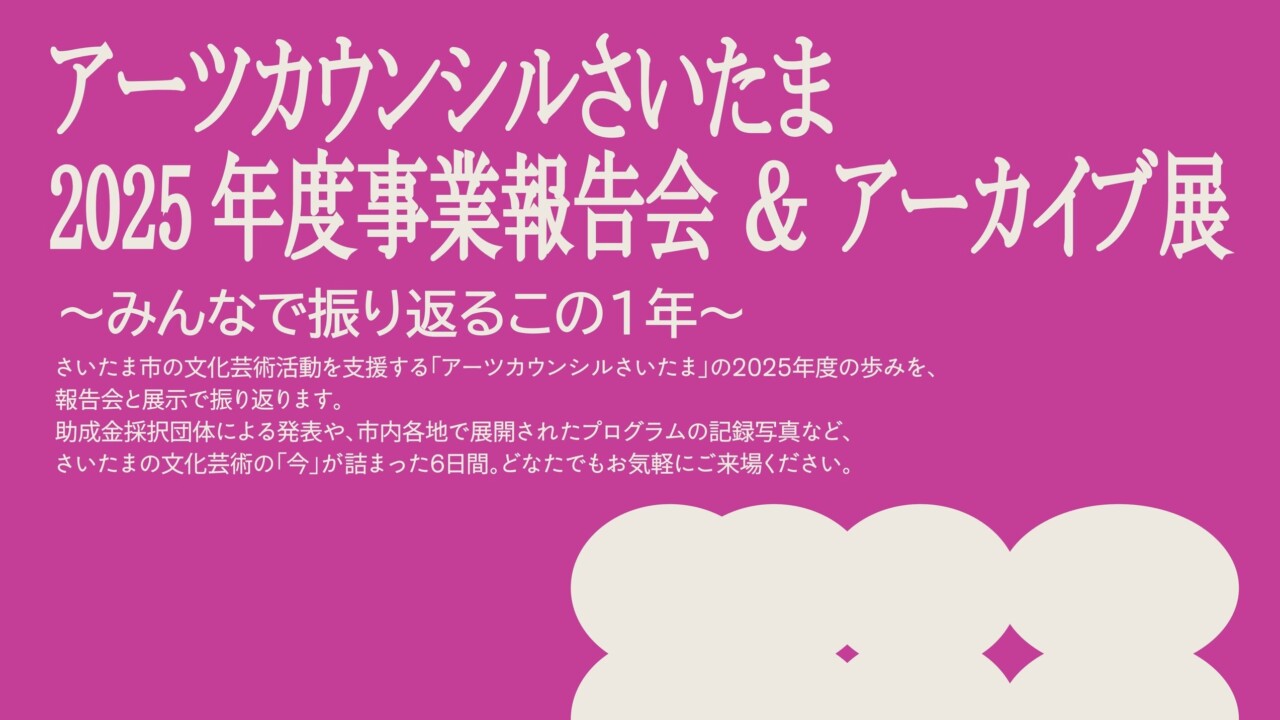 さいたま市の文化芸術活動を支援する「アーツカウンシルさいたま」の2025年度の歩みを、報告会と展示で振り返ります。